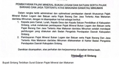 Info Sintang – Bupati Sintang menerbitkan Surat Edaran terkait penguatan pemungutan pajak mineral dan pajak…
